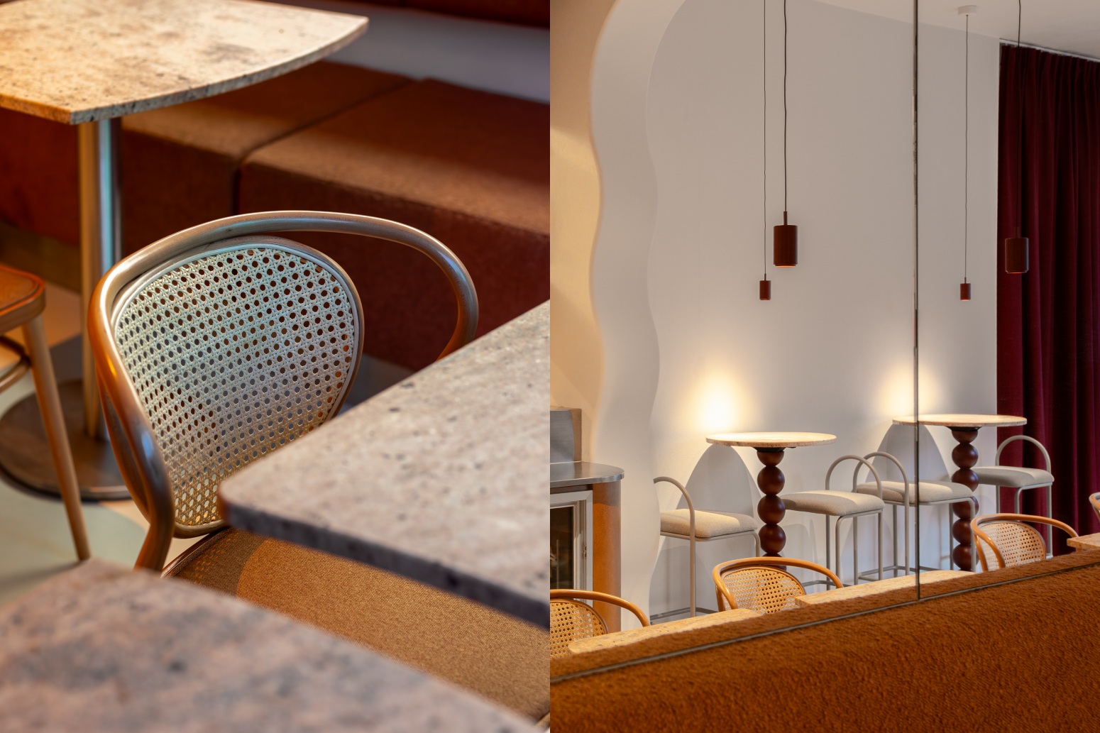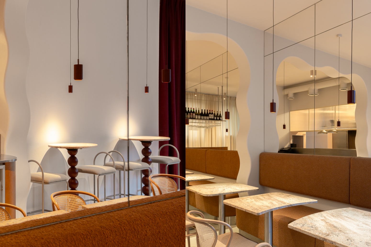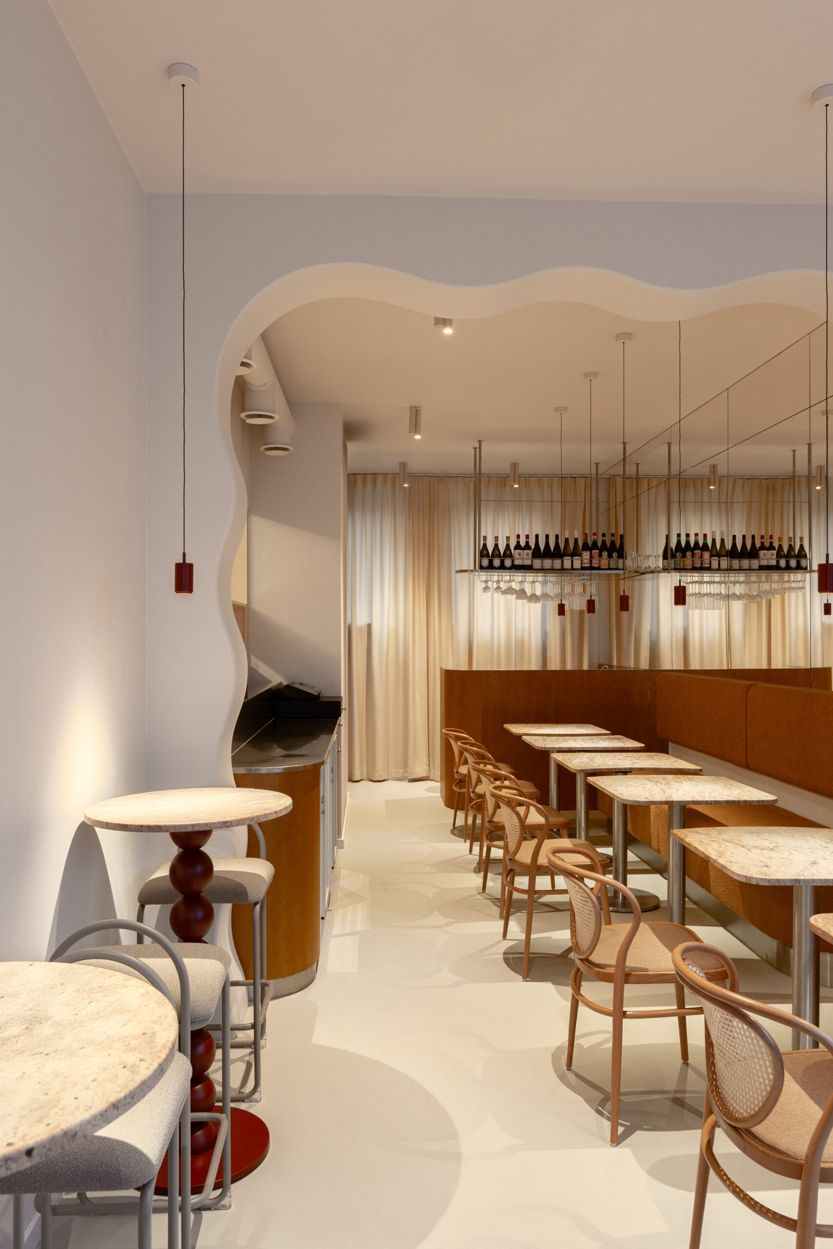 Podłużna sala bistro została zaaranżowana tak, aby maksymalnie wykorzystać przestrzeń. Nieregularne, kamienne stoliki ustawione wzdłuż ścian tworzą przytulne zakątki. Salę zwieńcza bar, który stanowi elegancką dominantę przestrzeni. Otwarta kuchnia zlokalizowana w centralnej części bistro, z różowym wnętrzem, pozwala gościom podglądać pracę szefów kuchni.