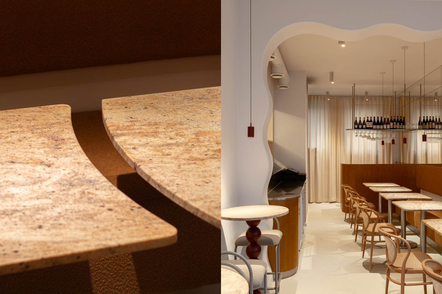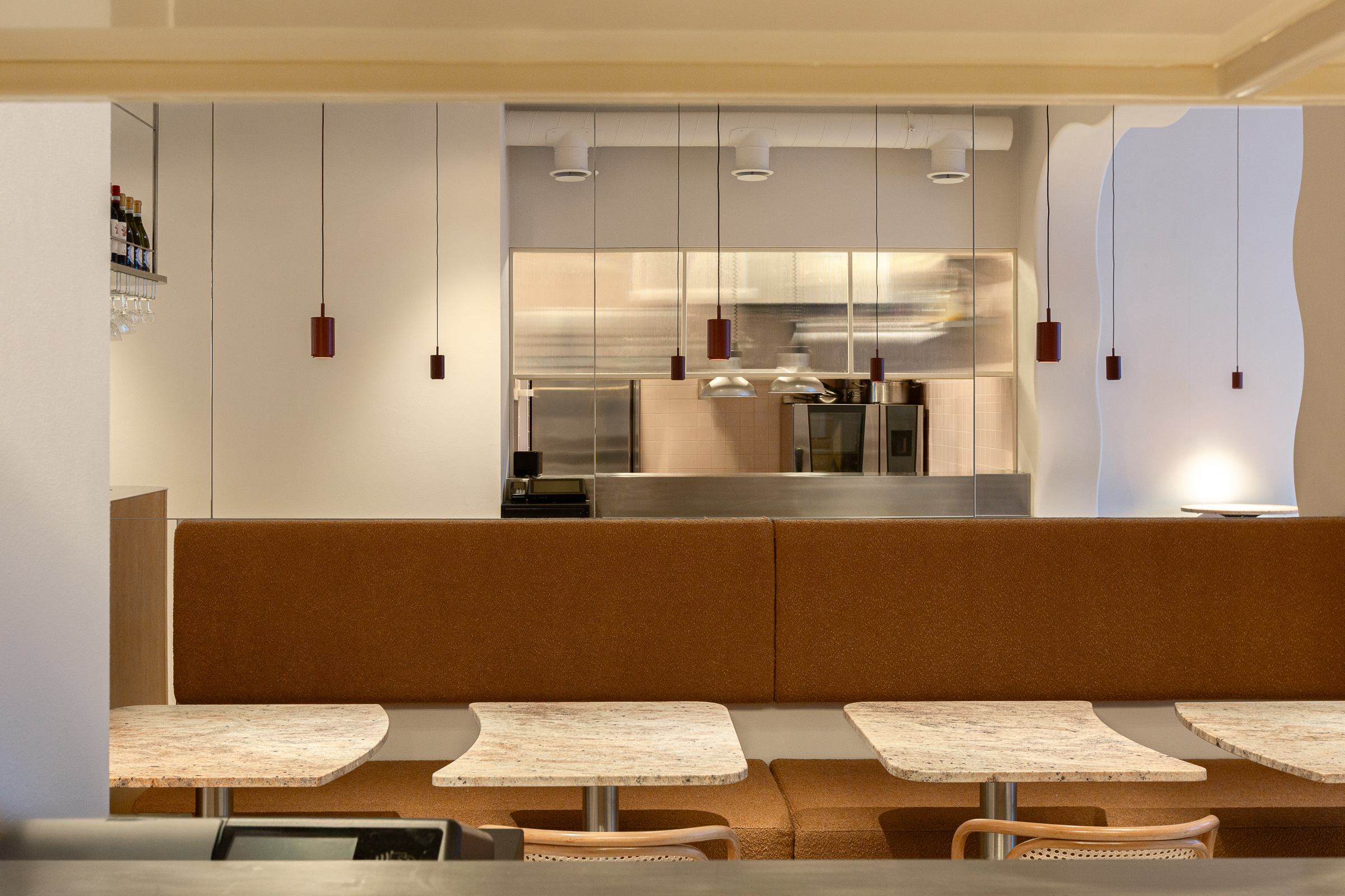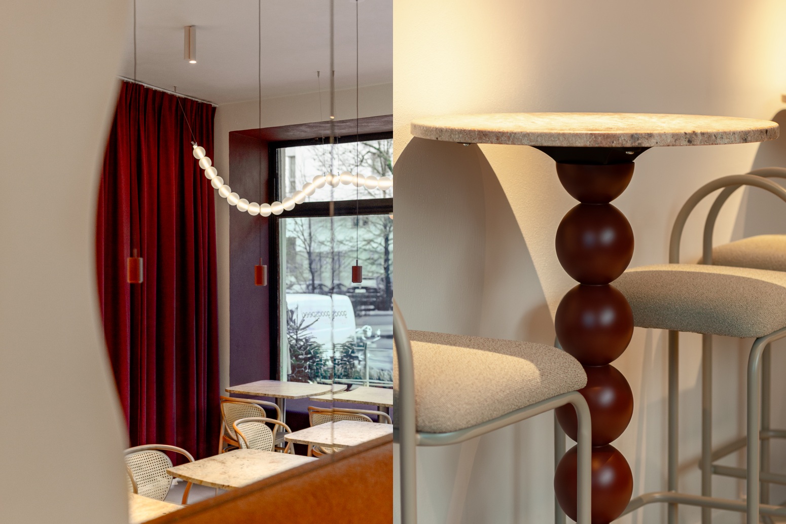 Podłużna sala bistro została zaaranżowana tak, aby maksymalnie wykorzystać przestrzeń. Nieregularne, kamienne stoliki ustawione wzdłuż ścian tworzą przytulne zakątki. Salę zwieńcza bar, który stanowi elegancką dominantę przestrzeni. Otwarta kuchnia zlokalizowana w centralnej części bistro, z różowym wnętrzem, pozwala gościom podglądać pracę szefów kuchni.