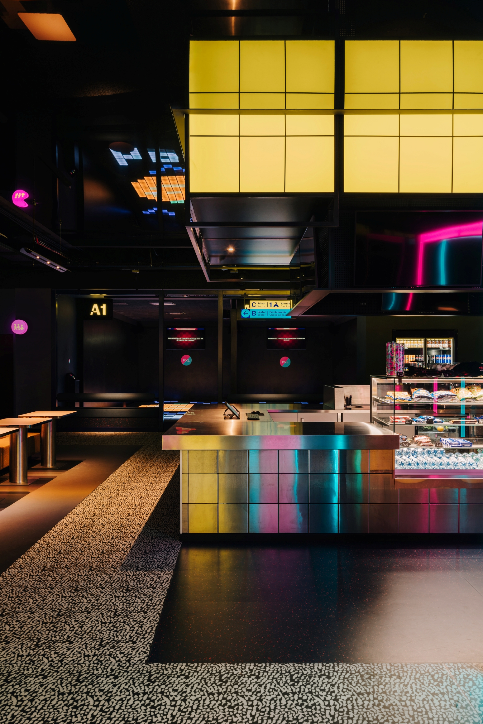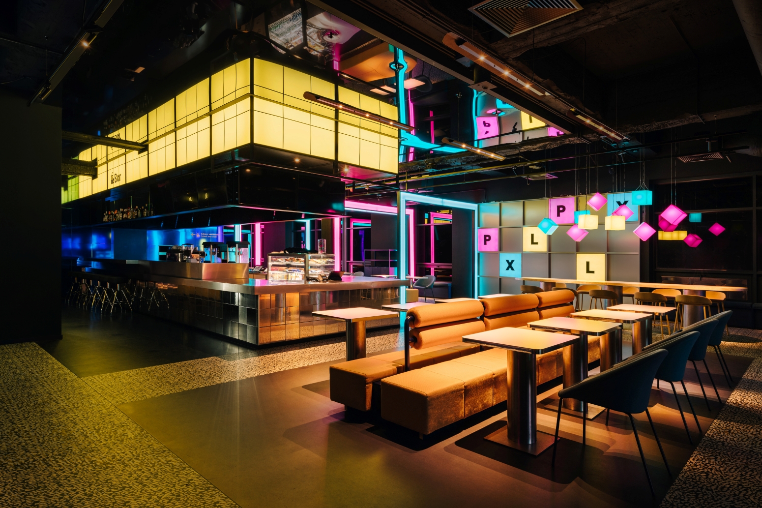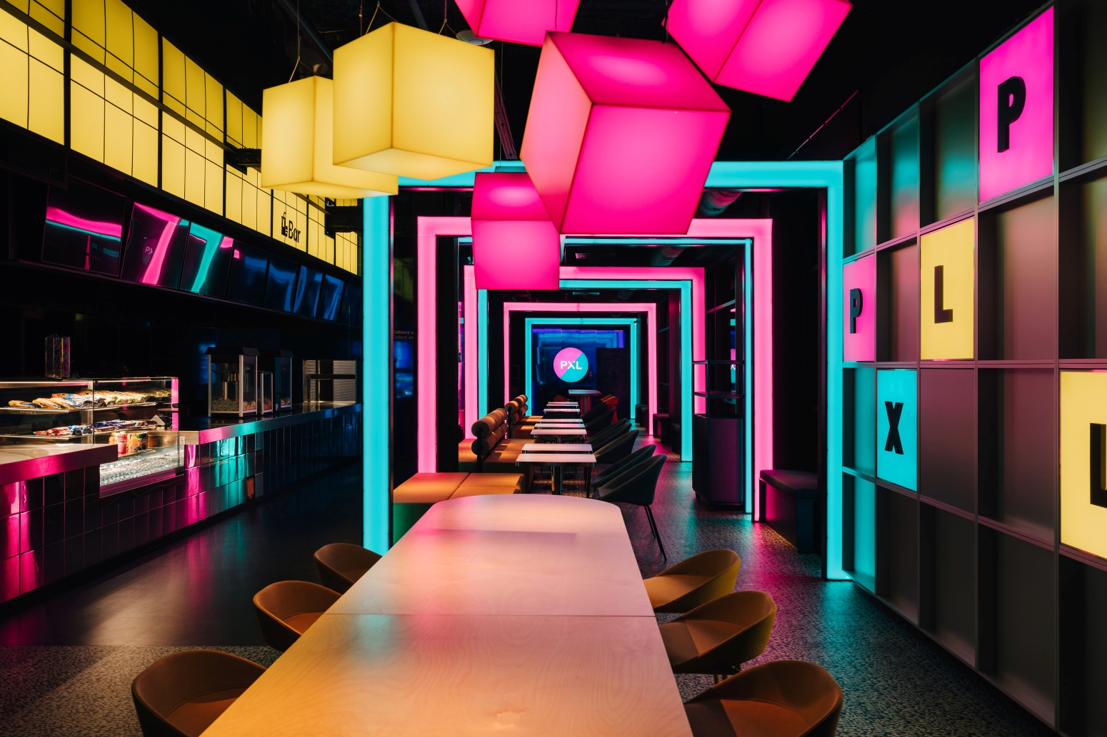 Przestrzeń została zaprojektowana tak, aby strefy harmonijnie się przenikały, eliminując bariery wizualne i jednocześnie zapewniając każdej strefie do gier dedykowane miejsce do odpoczynku. W efekcie powstała transparentna i wizualnie charakterystyczna przestrzeń, która nie tylko sprzyja swobodnej interakcji między wnętrzem a otoczeniem, ale również podkreśla unikalny charakter miejsca.