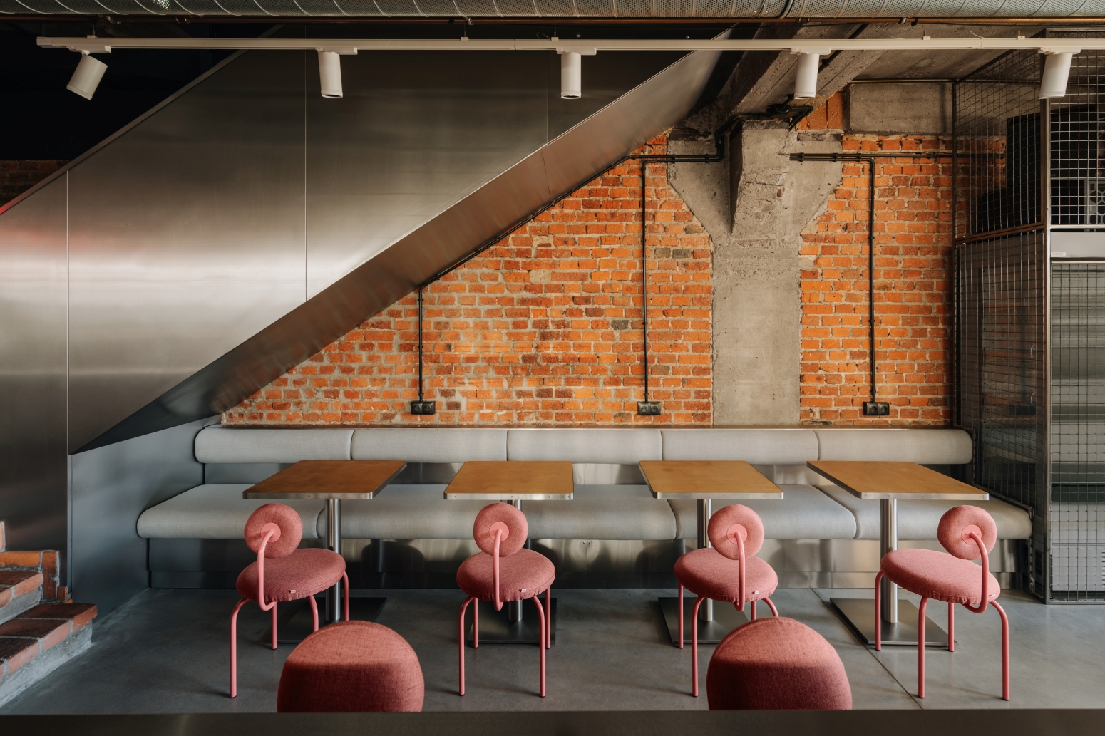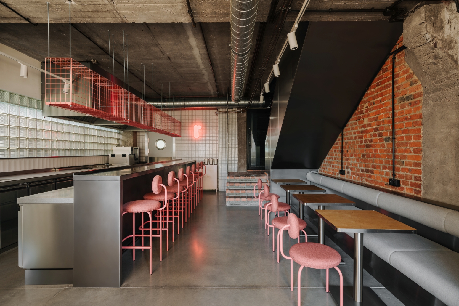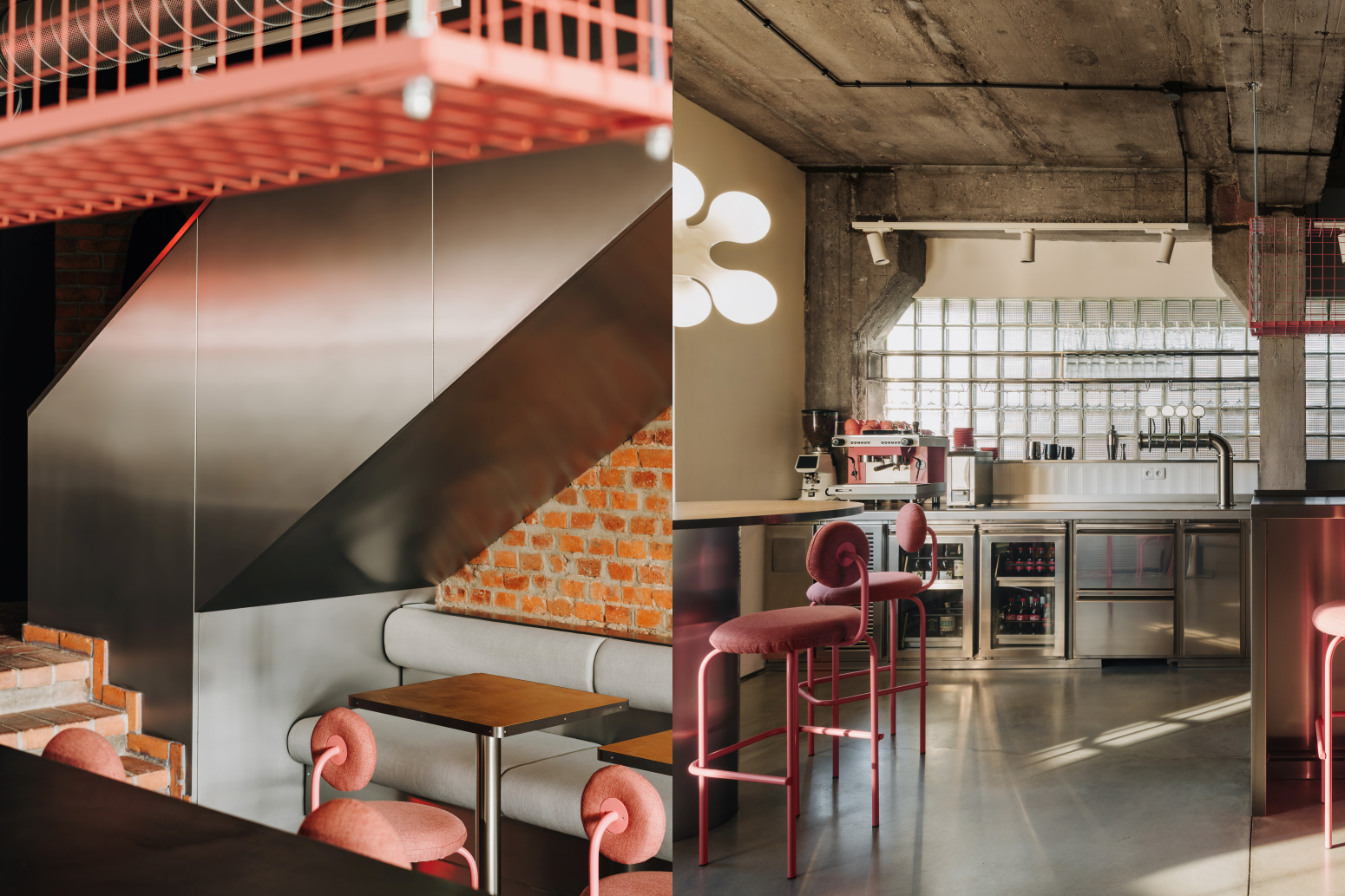 Sercem wnętrza jest otwarta, dobrze wyeksponowana kuchnia, która płynnie łączy się ze strefą dla gości. W centralnym punkcie umieszczony został bar z nawisem, a tuż za nim ciąg technologii i otwarta strefa robocza z różowym ekspresem do kawy. Przy wejściu umieściliśmy wysoki stół typu "common", który zachęca do wspólnego spędzania czasu. Natomiast w strefie pod schodami zaplanowaliśmy miejsce na dwuosobowe stoliki, co optymalizuje wykorzystanie przestrzeni. Cały układ jest przemyślany tak, by maksymalnie wykorzystać niewielką powierzchnię, zapewniając jednocześnie wygodę, funkcjonalność i klimat.