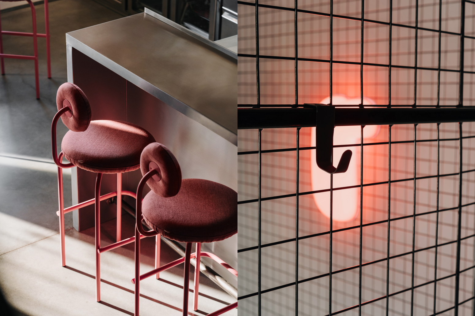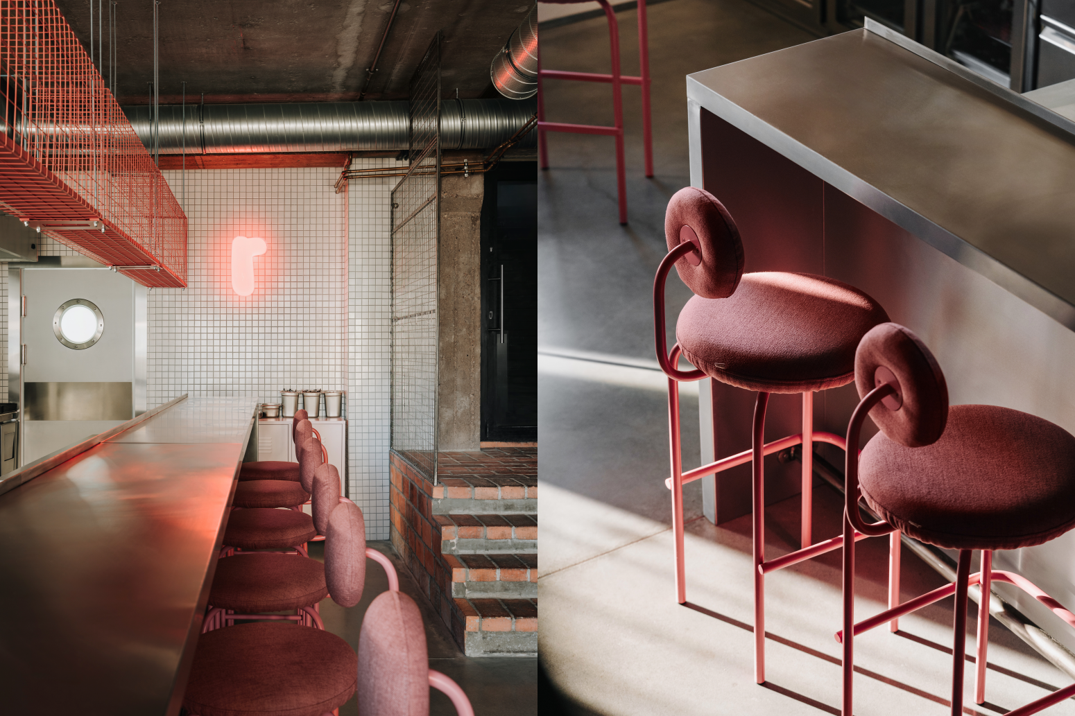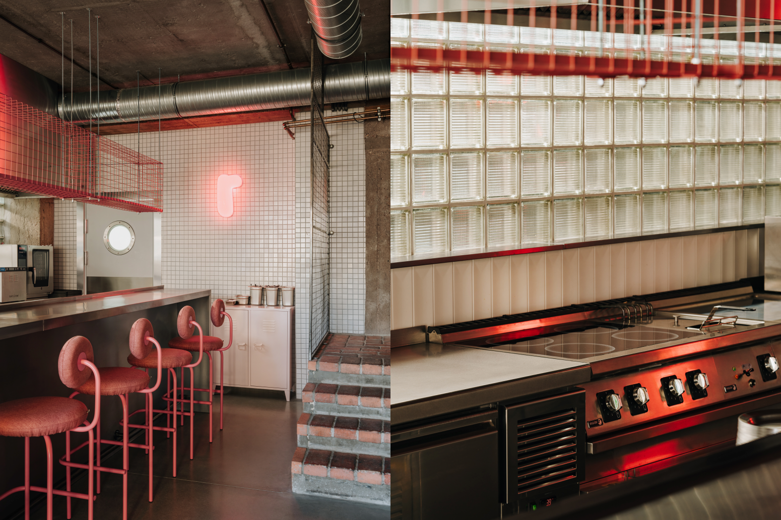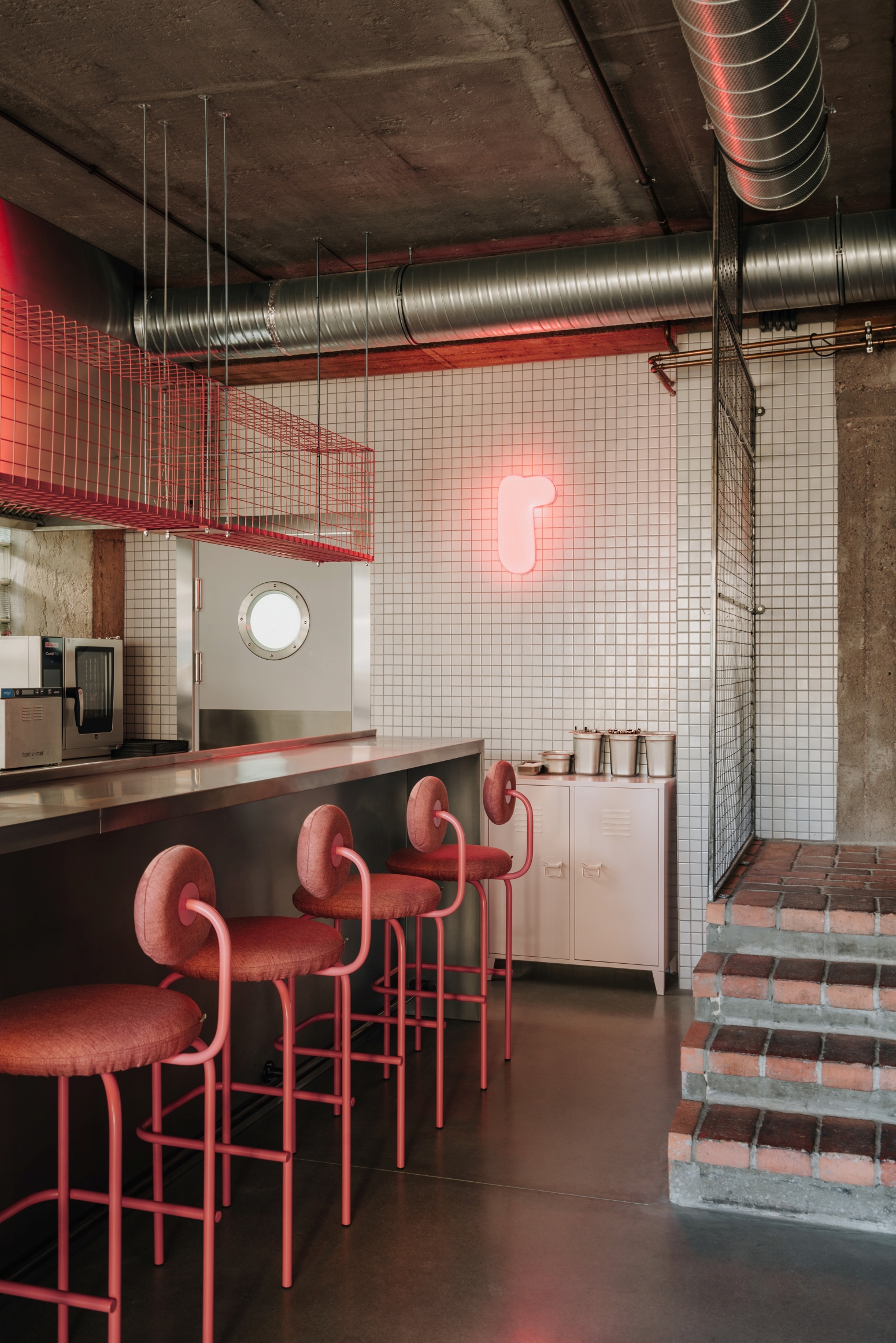 Sercem wnętrza jest otwarta, dobrze wyeksponowana kuchnia, która płynnie łączy się ze strefą dla gości. W centralnym punkcie umieszczony został bar z nawisem, a tuż za nim ciąg technologii i otwarta strefa robocza z różowym ekspresem do kawy. Przy wejściu umieściliśmy wysoki stół typu "common", który zachęca do wspólnego spędzania czasu. Natomiast w strefie pod schodami zaplanowaliśmy miejsce na dwuosobowe stoliki, co optymalizuje wykorzystanie przestrzeni. Cały układ jest przemyślany tak, by maksymalnie wykorzystać niewielką powierzchnię, zapewniając jednocześnie wygodę, funkcjonalność i klimat.